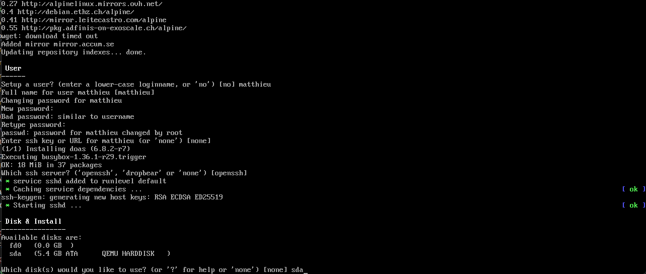 Sur l'image suivante, à la fin, on voit qu'il nous demande sur quel disque dur on veut installer alpine. On va lui dire de l'installer sur le disque qu'on a créé. On voit ici que le "QEMU DRIVE" est sda. On entre donc sda.