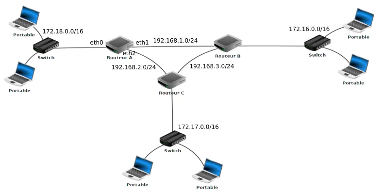 - Routeur A qui possède 3 interfaces réseau que l’on nomme eth0, eth1 et eth2. Les adresses IP liées à ces interfaces réseau sont : 172.168.255.254/16 (eth0), 172.169.255.254/16 (eth2) et 192.168.7.1/24 (eth1).