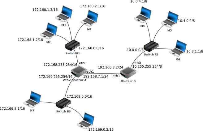 - R3 dont l’adresse est 172.169.0.0/16 avec deux machines M7 et M8.